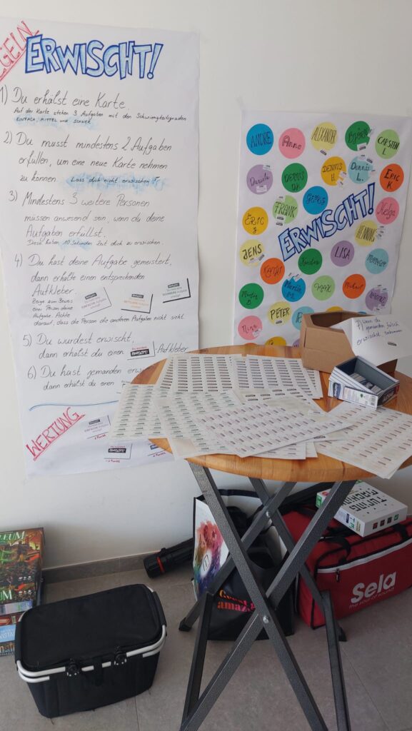 Ein neues Highlight an diesem Wochenende in der Eifel – „Erwischt!“. Über das ganze Wochenende verteilt sorgte das Spiel für viele spontane Lacher, Paranoia und einige ertappte Gesichter, wenn jemand mitten im Satz plötzlich merkte, dass er gerade eine Aufgabe ausgelöst hatte – Menschen die plötzlich aus dem Fenster kletterten, besondere Komplimente machten, seltsame Dinge erzählten, Getränke von anderen stibitzen und vielen weiteren witzigen Begebenheiten.