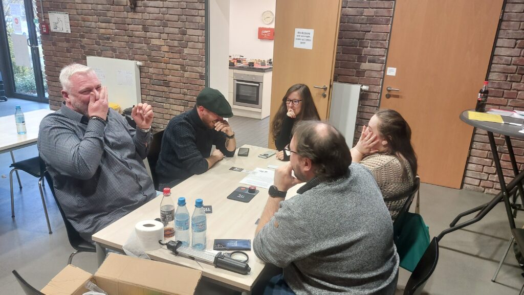 Zuerst mussten die Teilnehmenden der Gruppe eine der Rolle (Sprecher, Fragesteller, Optimist, Kritiker, Vermittler, Bremser, Chaot) mit definierten Fähigkeiten und Einschränkungen übernehmen und sich in dieser Konstellation auf eine Diskussion einlassen. Ziel war es, sich gemeinsam auf fünf Spiele und fünf Gegenstände zu einigen. Anschließend galt es, durch einen korrekten Durchlauf von „Stille Post Extrem“ Lösungsfragmente zu erspielen, die für die Flucht aus dem Dungeon benötigt wurden. Darauf folgte ein kniffliges Rätsel: Mithilfe von Hinweisen musste die richtige Position einer Miniatur, einer Spielkarte, eines Würfels und eines Spielplättchens ermittelt werden. In einer speziellen Top-10-Variante zum Thema BCN / Ehrenamt / Brettspiel wurden aberwitzige und haarsträubende Geschichten vorgetragen, um weitere Lösungsfragmente zu erhalten. Wer sich zu Beginn für die Lupe entschieden hatte, war beim Mini-Wimmelbild klar im Vorteil. Die sechste Prüfung, „Das Orakel der Spiele“, stellte das Wissen der Teilnehmenden auf die Probe: Hättest du gewusst, welches das höchste Gremium in unserem Verein ist, wie viele Karten die Standard-Edition von Ligretto enthält oder wann der Brettspiel Club Niederrhein e.V. gegründet wurde? Zum Abschluss mussten alle gesammelten Fragmente zusammengepuzzelt werden, um den Code für das Sicherheitsschloss zu knacken und aus dem BCN-Dungeon zu entkommen.