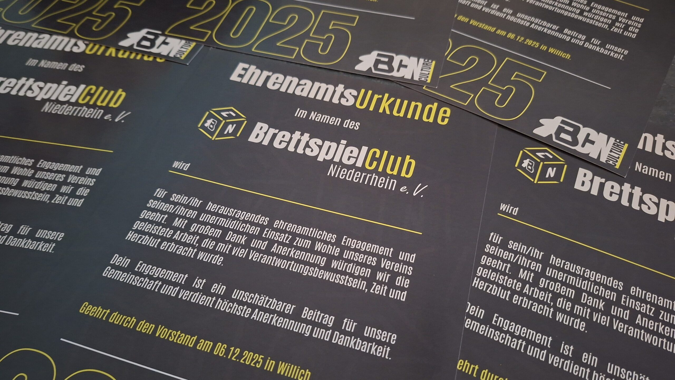 Am 06.12.2025 hat der Brettspiel Club Niederrhein e.V. ein starkes Zeichen gesetzt: Mit dem „Tag des Ehrenamts“ feierten wir all jene, die mit ihrem Engagement das Fundament unseres Vereins bilden und ihn lebendig gestalten. Ehrenamt ist nicht nur eine Tätigkeit – es ist Herzblut, Leidenschaft und der Motor für alles, was wir gemeinsam als Verein erreichen – egal ob spannende Events und besondere Aktionen, volle öffentliche Spieletreffs, Mitgliederwachstum, Digitalisierung, eine großartige Webseite oder einen professionellen Auftritt in der Öffentlichkeit.